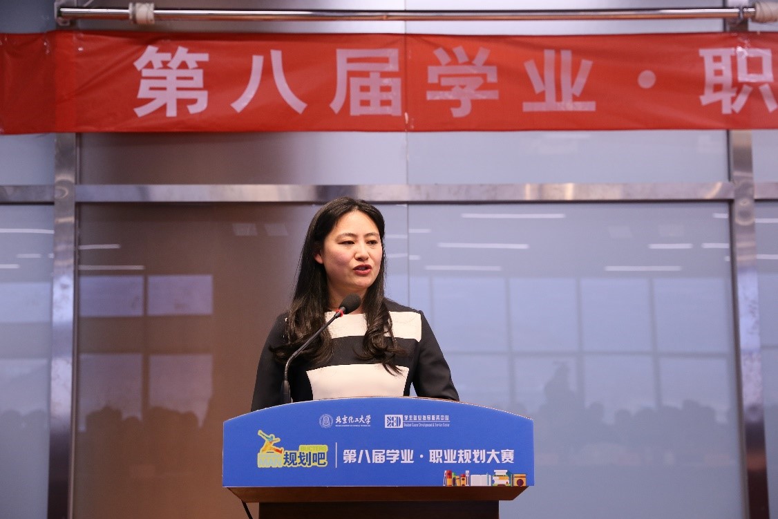 在评委点评环节,儒亚科技(北京)有限公司创始人董事郑博女士对大赛活动组织与选手的表现给予了高度肯定。她建议同学们的生涯规划可以更加完善,从长期、中期、近期不同维度进行规划。最后她结合自己的校园活动经历,勉励同学们积极参与学校搭建的各类学习平台,提升自身学业职业素养,为就业创业打下良好基础。