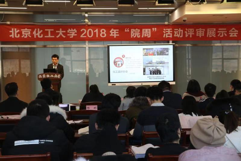 12月12日下午,北京化工大学2018年“院周”活动(第25届)评审展示会在昌平校区图书馆五层学术报告厅举行。校党委副书记宋来新,学生工作办公室主任商云龙、国际教育学院党总支书记刘振娟、北校区工作办公室副主任孙忠博、学生工作办公室副主任丁贞栋、学生工作办公室副主任李浚、各学院党委副书记、全体辅导员、学生代表参加本次评审会,中国石油大学学工部副部长刘春阳作为特邀嘉宾参加此次评审会。