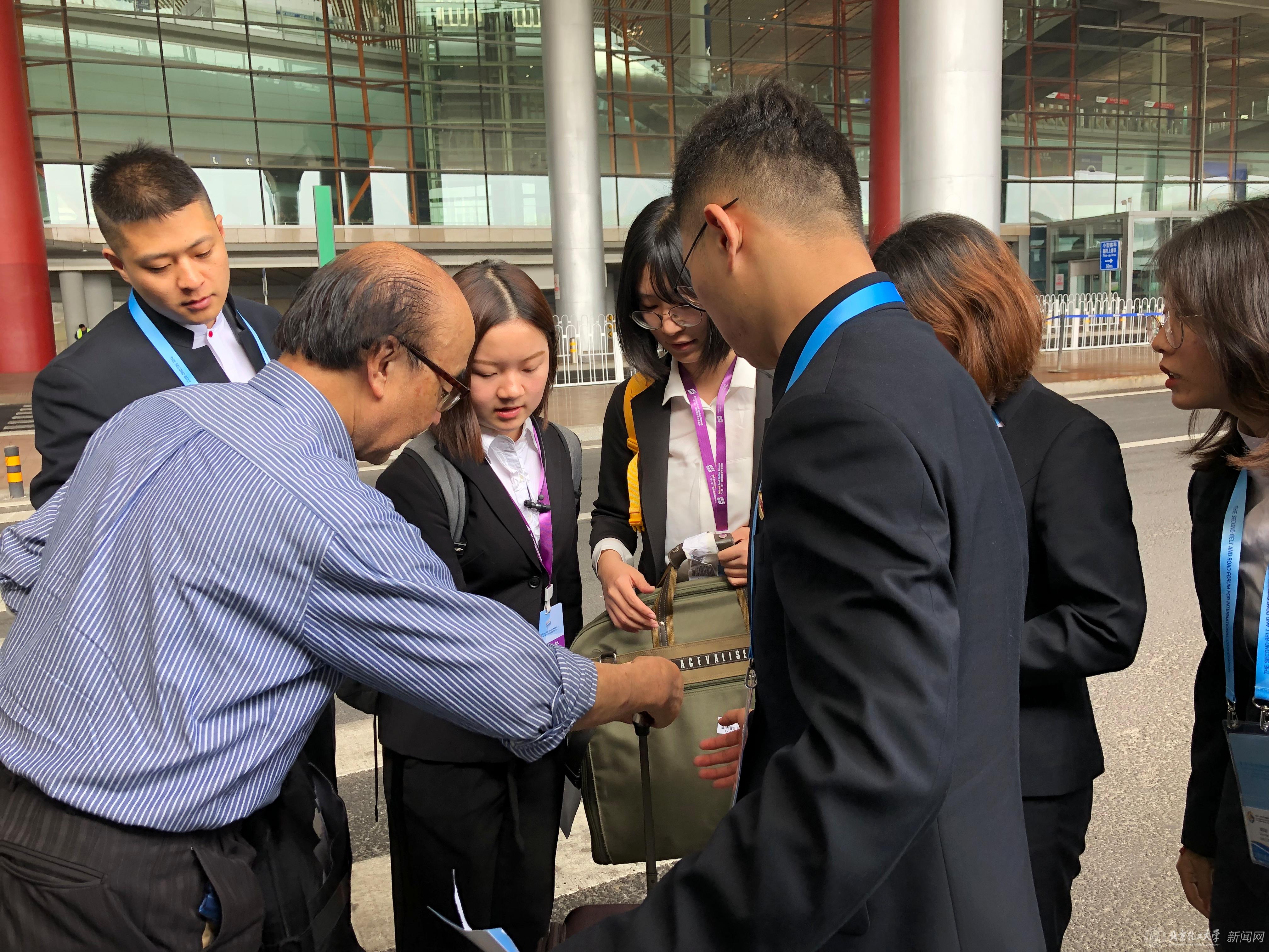 在前往首都机场T3航站楼的途中,在迎接第一批到来的媒体友人之时,来自北化的数名志愿者主动为来宾提行李、热心帮助解决问题,全力展现首都高校志愿者的靓丽风采。