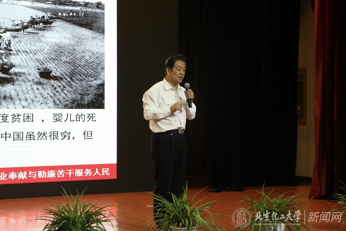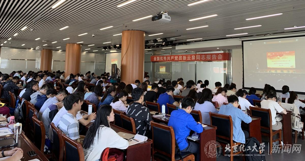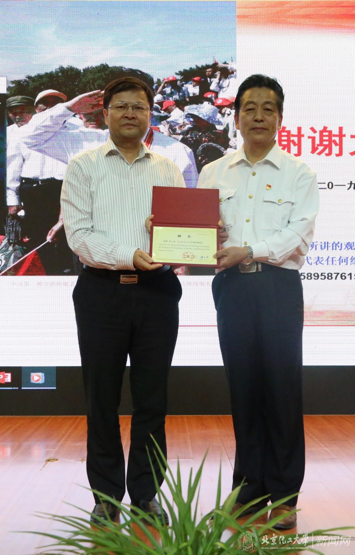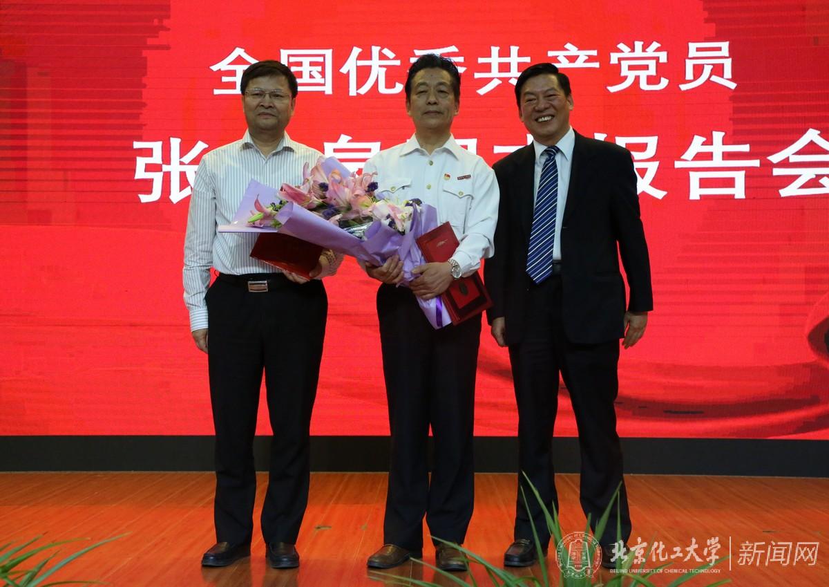 报告会上,北京化工大学校长、中国工程院院士谭天伟为张云泉同志颁发**教授聘书和大学生思想政治教育校外导师聘书,学生代表为张云泉佩戴校徽并献花。