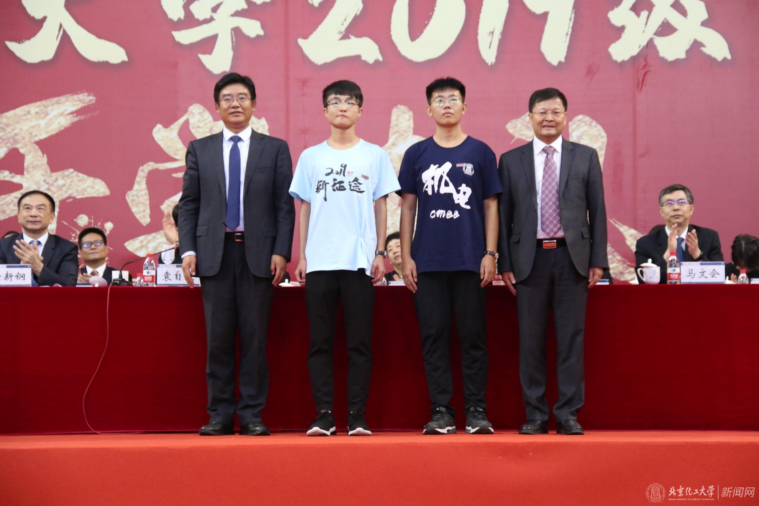 仪式上,谭天伟、宋来新为新生代表佩戴上北京化工大学校徽。