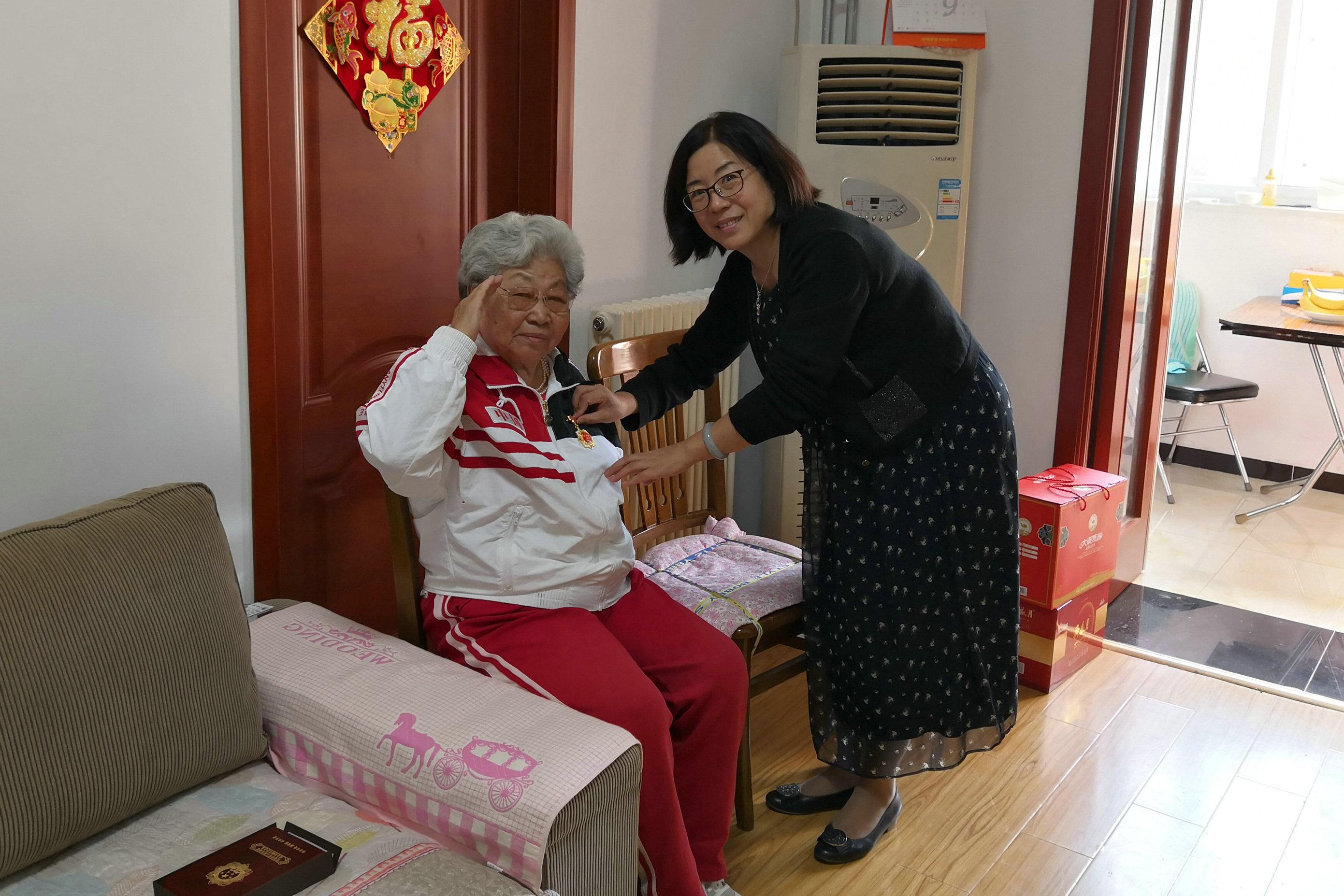 86岁的老战士何简文在收到纪念章和贺信时,腿虽然站不起来,但坐着敬军礼,久久不愿放下,表达了一名老战士对党和国家无比赤诚的忠心。在特意做的一个展式台前,她向大家展示了自己从参加革命工作到当兵,到成为一名光荣的人民教师的照片、实物,回忆了她为革命工作的**岁月。她还制作了小纪念品赠送给慰问人员,感谢党和国家给予这样至高无尚的荣誉。