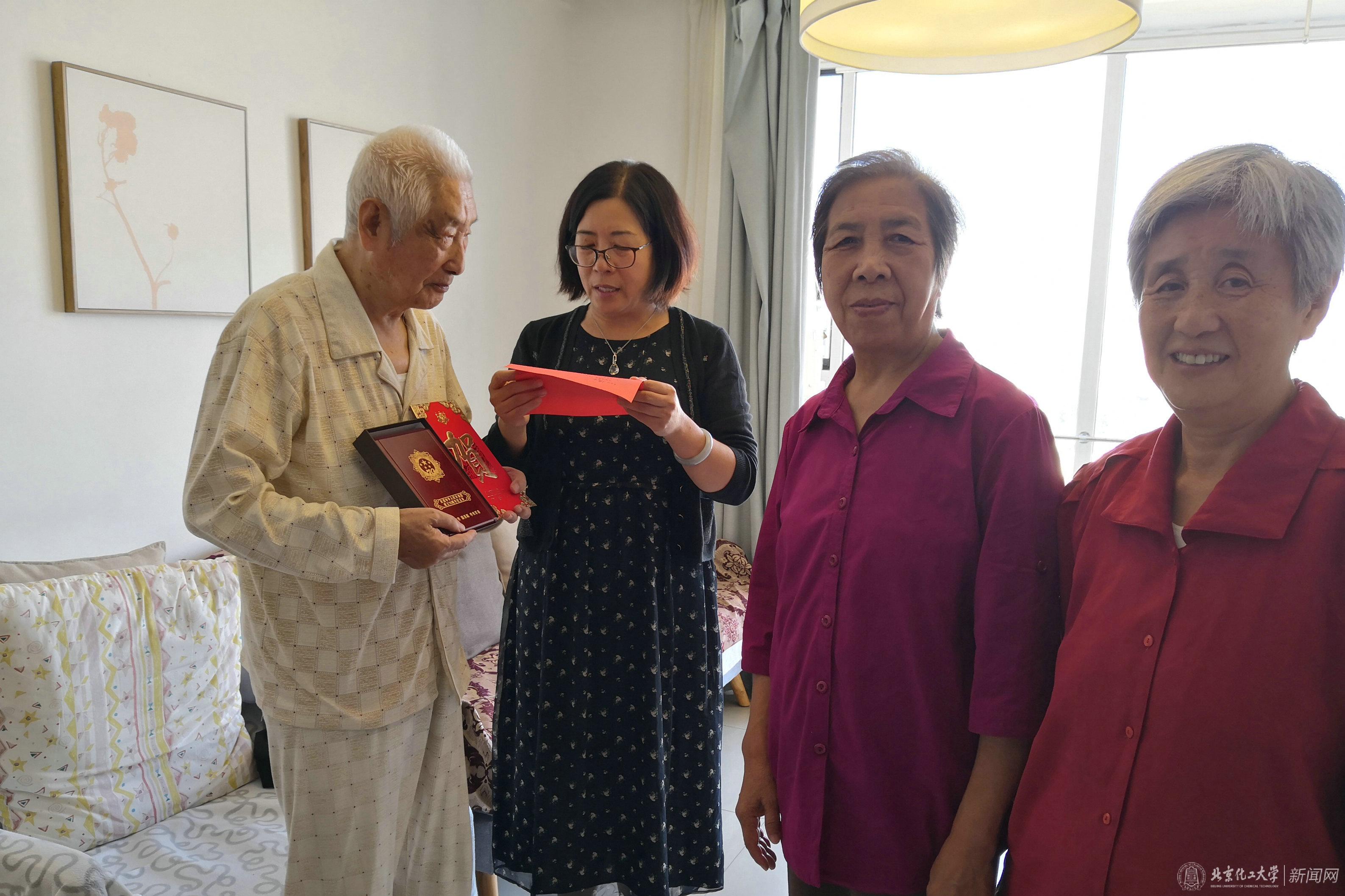 有着69年党龄的学校原副院长、老党员王春生双目失明,当离退休处党总支书记刘振娟贴心地为他宣读学校的贺信,感谢他为国家做出的贡献时,他感到无比的骄傲和自豪,91岁高龄的老人坚持双手紧紧抱着纪念章,站立聆听,在场人员无不动容。他表示,非常珍惜国家给的荣誉,作为一名老党员,一定不忘初心,牢记使命,为祖国建设唱响正能量。