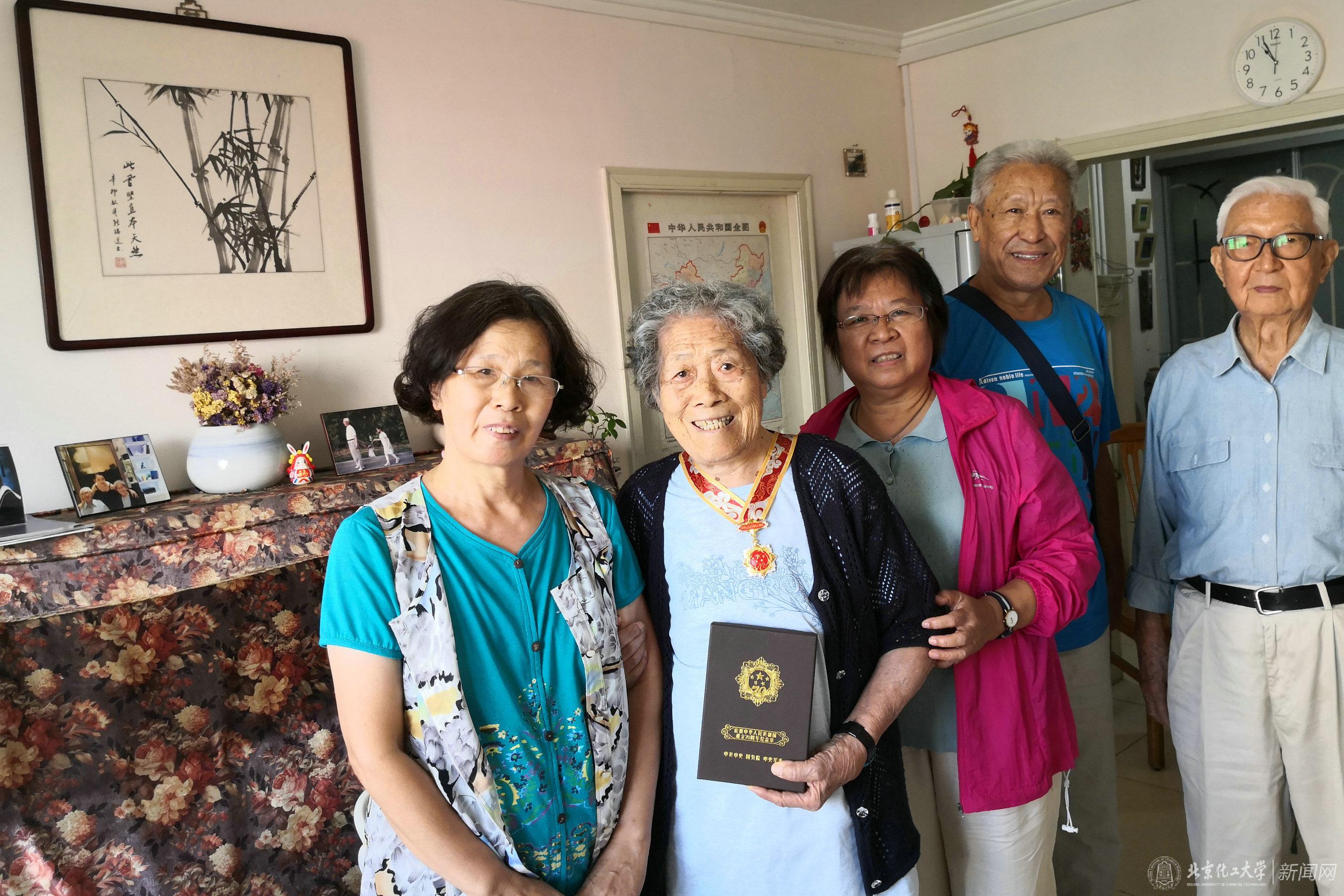 去慰问90岁老党员张瑞莲的离退休党支部书记和委员应张老师之邀举行了简短的颁发仪式。张老师激动地说:“今天我非常荣幸地接受了由中共中央、国务院、中央军委颁发的‘庆祝中华人民共和国成立70周年纪念章 ’,这是我一生最光荣最激动的时刻!我由衷地感谢党中央!我们伟大的祖国万岁!我爱我们的中国!”张老师嘱咐女儿将这一过程录像纪念后,特意以自己所画的竹子为背景,佩戴纪念章和慰问人员合影留念。