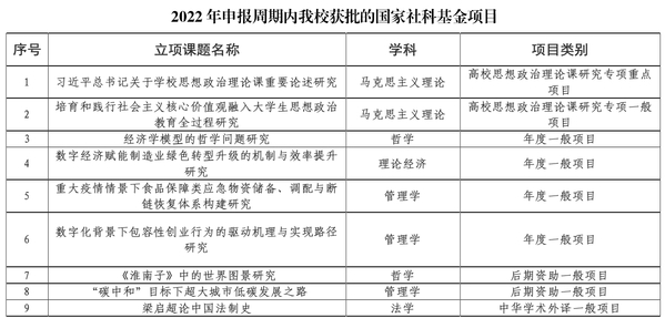 在2022年申报周期内,我校共获批4项年度项目、2项高校思想政治理论课研究专项项目、2项后期资助项目、1项中华学术外译项目。四个类别的国家社科基金项目共获批9项,取得历史性突破。特别是我校首次成功申报国家社科基金高校思想政治理论课研究专项重点项目,是继我校马克思主义学院入选第三批北京市重点建设马克思主义学院之后,我校马克思主义学科建设和思想政治理论课建设的又一具有里程碑意义的重要进展。