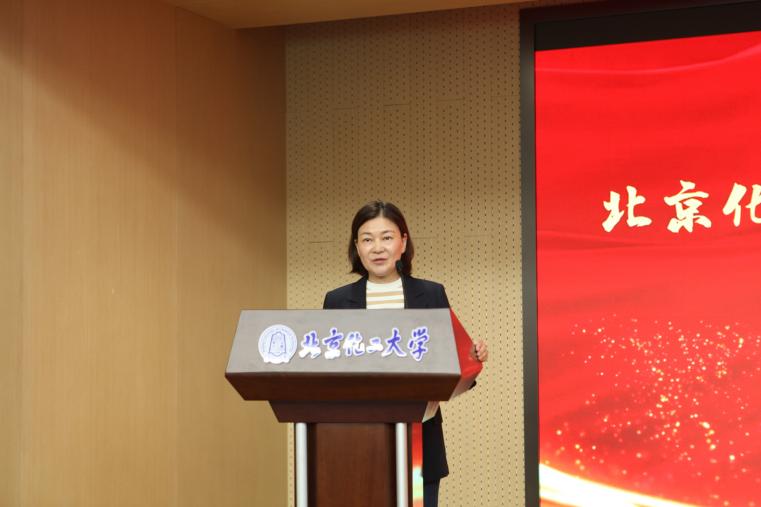 张家港迪克汽车化学品有限公司总经理钱雪芬致辞。她表达了对获奖学生的衷心祝贺和殷切希望,以及对老师们辛勤付出的感谢与肯定,希望迪克化学与北化携手共赢,共同成长!