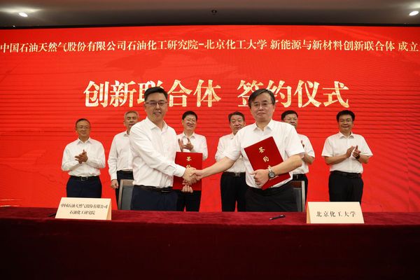 “中国石油天然气股份有限公司石油化工研究院-北京化工大学新能源与新材料创新联合体”是双方为贯彻国家创新驱动发展战略,推进国家知识创新体系与技术创新体系的深度融合,加快科技成果向现实生产力的转化,共同打造的龙头企业牵头、高校院所支撑的联合研发机构。创新联合体以习近平新时代中国特色社会主义思想为指导,落实国家创新驱动发展战略,构建“产学研用”融合的校企协同创新模式,依托双方科技创新力量和产业化资源,以国家战略需求和中国石油的产业布局为导向,对标国际领先、面向国家战略、瞄准科技前沿,在新能源与新材料等相关领域深化基础研究,取得关键技术突破,在重点领域推进产业化进程,助力中国石油炼化产业转型升级,突出理论创新前沿引领性和技术应用示范性,发挥北化在基础研究与原始创新,以及中国石油在应用研究、工程放大与产业转化方面的优势,推动新能源和新材料技术的变革。