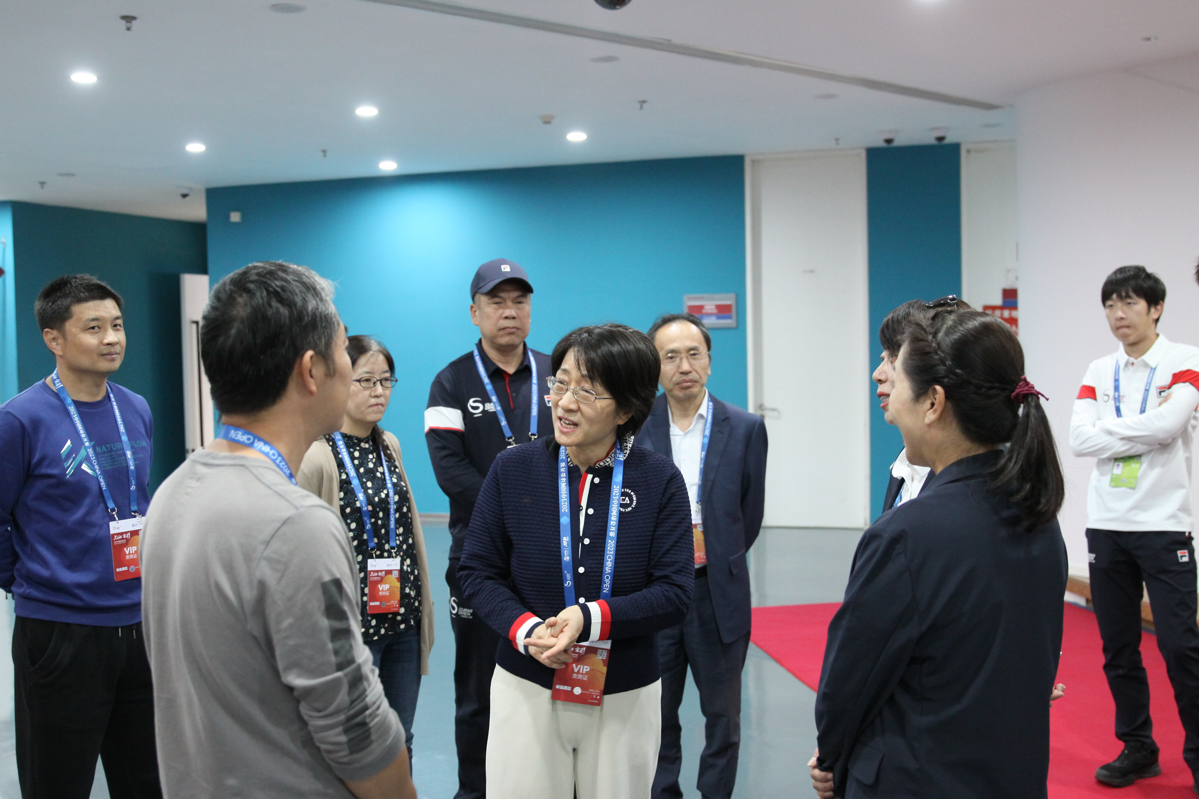 苏海佳看望参加专业实习的师生,了解师生实习情况并听取带队教师相关情况汇报。她对大家在中秋节和国庆节假期仍然坚守岗位,并以优异的表现服务赛事活动给予了充分的肯定和赞扬,鼓励大家再接再厉,展示学校风采,圆满完成赛事服务和实习任务。