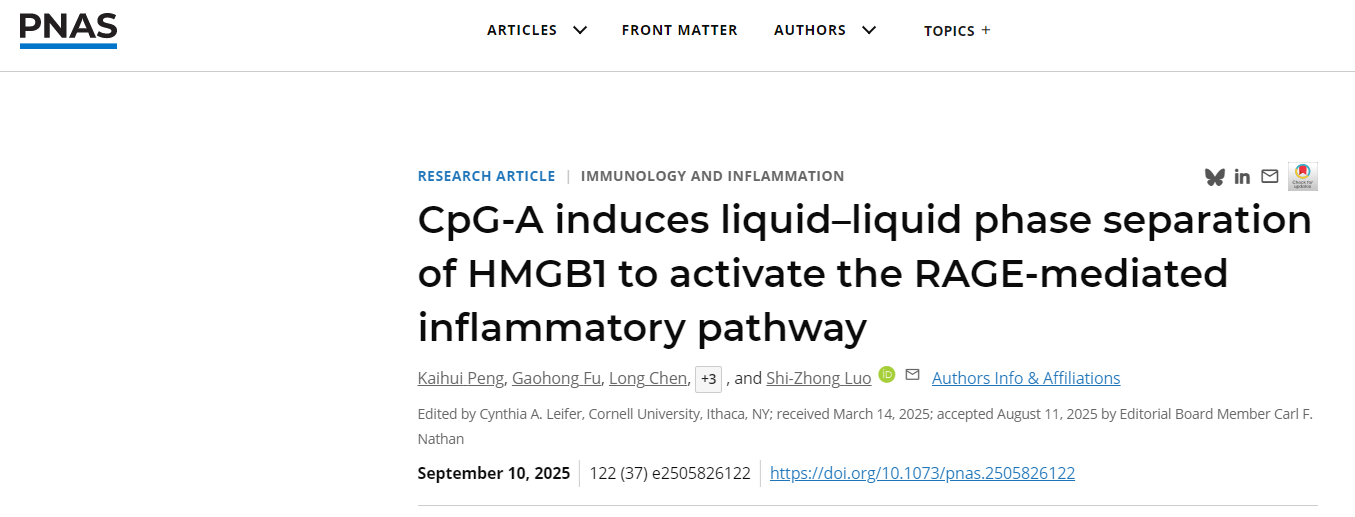 2025年9月10日,我校罗施中教授课题组在《Proceedings of the National Academy of Sciences of the United States of America》发表了题为“CpG-A induces liquid–liquid phase separation of HMGB1 to activate the RAGE-mediated inflammatory pathway”的研究论文,提出了一种新机制:胞外生物分子的相分离可驱动胞内信号分子的相分离,从而实现免疫信号的快速高效跨膜转导。