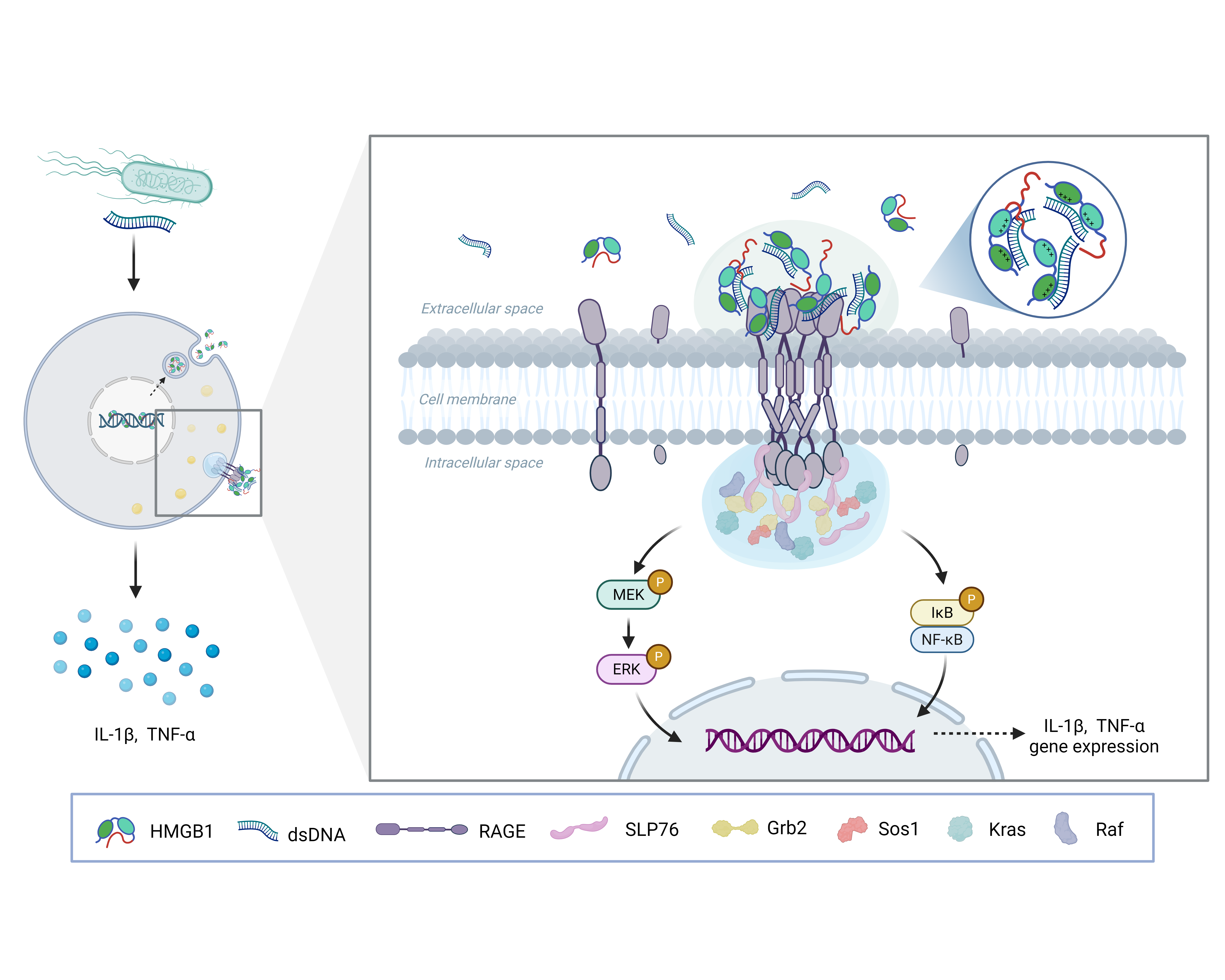 图1.双链DNA诱导HMGB1相分离激活巨噬细胞中RAGE介导炎症信号通路的模型