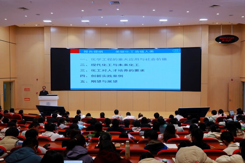 陈建峰院士以“为什么要上大学”“在大学想做什么”“怎么做”三个问题为引,指出科技创新为人类文明进步提供不竭动力,工程科技是改变世界的重要力量。他系统回顾了化学工程学科的百年演进历程与发展趋势,系统阐述了化学工程在衣食住行等日常生活各领域所带来的深刻影响,有力论证了未来化工必然朝着高端化、智能化、绿色化的方向迈进。在此基础上,他进一步指出新时代化工人才应具备的核心精神品质——高尚的爱国主义情怀、积极的创新意识与自强不息的奉献精神,并以团队在超重力反应强化领域创新实践为例,进一步揭示了创新在工程实践中的强大驱动力。最后,陈建峰院士勉励同学们志存高远、脚踏实地,自立自强、开拓创新,把个人抱负与国家需求融为一体,在报效国家的同时实现个人价值,成为强国建设、民族复兴伟业的国家栋梁、大科学家、大工程师。