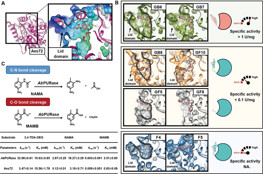团队利用GRASE工具,从宏基因组数据中成功挖掘到多个具有氨基甲酸酯降解活性的酶,其中来源于脂环酸芽孢杆菌属(Alicyclobacillus sp.)的AbPURase酶表现出全方位的优异特性。该酶具有一个V形活性口袋,该结构由一个紧密的疏水核心及多个脯氨酸残基所稳定的盖结构域构成。这一独特的结构不仅有助于酶与底物的结合,还有效阻隔了有机溶剂分子向活性中心的渗透,从而保障了AbPURase在高浓度有机溶剂中结构和功能的完整性。