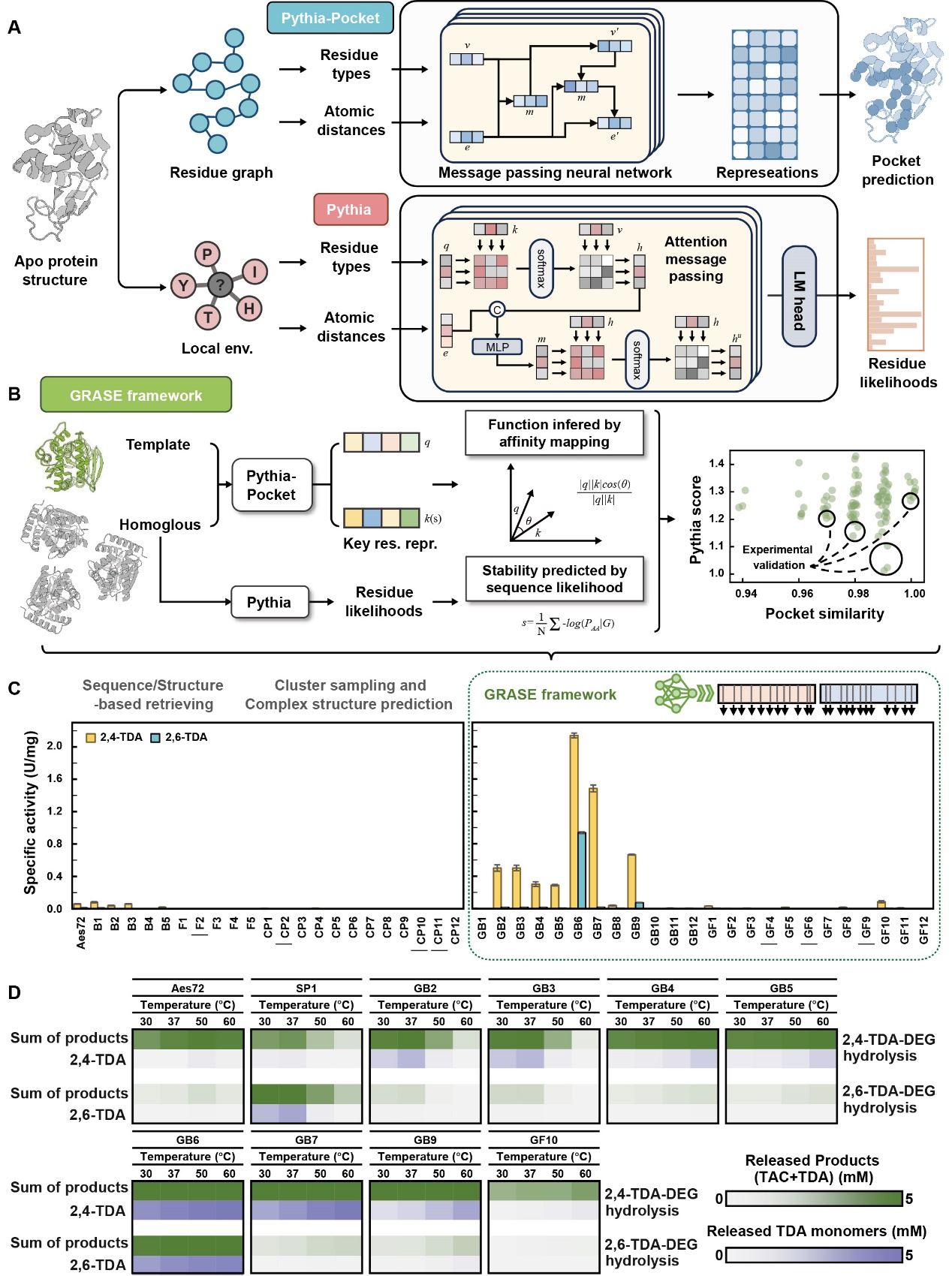 为实现聚氨酯的生物酶解,关键在于开发能够高效水解氨基甲酸酯键的脲酶。然而,现有的EC酶分类系统中,对这类脲酶的分类标注存在缺失。目前已知的少数可水解芳香类氨基甲酸酯的脲酶,在传统生物信息学分类中均被标识为脂肪酶或酰胺酶。因此,研究团队基于前期自主开发的蛋白质Pythia预训练模型(The Innovation 2025, 100750, https://pythia.wulab.xyz),结合监督学习与自监督学习,进一步开发了基于图神经网络的酶挖掘工具GRASE(GNN-based Recommendation of Active and Stable Enzymes)。该工具通过估计蛋白质序列与结构之间的似然性,预测蛋白质稳定性;并利用图神经网络提取催化口袋中氨基酸的局部微环境与整体结构信息,通过在高维空间中计算不同催化口袋特征向量之间的余弦相似度以度量其功能相似性,从而实现对酶底物特异性与反应偏好性的精细推断。