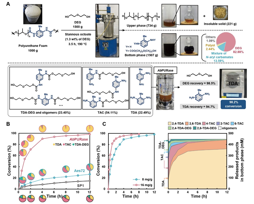 得益于其独特的天然结构特性,AbPURase酶在工业醇解工艺中的高浓度二乙二醇环境中,活性高达已报道脲酶的465倍,显示出卓越的催化效率和极强的有机溶剂耐受性。在模拟工业化反应条件(底物载量500 g/L)的千克级商业聚醚型聚氨酯泡沫降解实验中,AbPURase在8小时内实现了98.6%的底物转化率,降解单体TDA及醇解剂DEG的回收率分别高达94.7%和98.5%。此外,AbPURase还表现出优异的操作稳定性,可在多轮循环中维持高降解活性,显示出该酶的工业应用潜力。