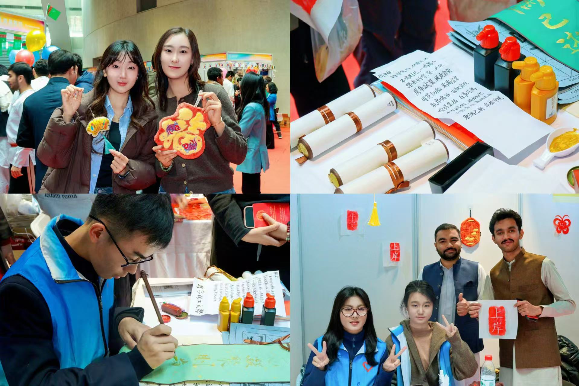 中外共创交流区,中外学生通过非遗拓印、传统剪纸和书法创作等活动,共同学习中华传统文化,在文化的交流中感悟文化自信。中外学子在协作中深化文化理解,于水墨丝线间筑牢文化自信,真正诠释"各美其美,美美与共"的人文内涵。