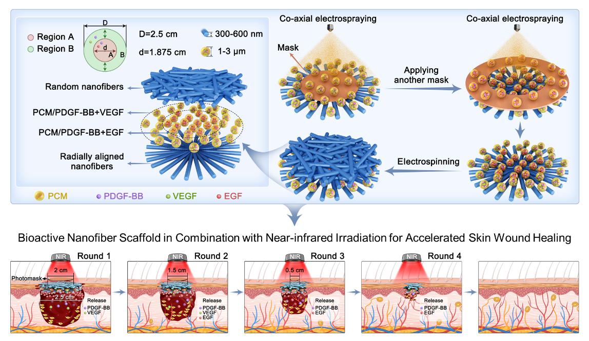 大面积皮肤损伤修复是临床长期未解的难题。皮肤再生涉及炎症调节、血管新生、上皮重建到胶原重塑等连续阶段,不同阶段对生长因子的需求不同,而如何实现其时序与空间的精准释放仍面临挑战。针对这一问题,研究团队通过静电纺丝结合掩模板同轴喷雾技术,在放射状纳米纤维支架上,实现载有特定生长因子的相变微粒的区域化沉积,并利用近红外光照与可替换光掩模板触发局部微粒固液相变,从而实现指定生长因子在不同时间点的可控释放。该策略将材料拓扑结构与生物活性因子递送相结合,形成多重协同诱导信号,可在兔与猪全层皮肤缺损模型中显著加速伤口闭合,促进血管新生、上皮重建与胶原重塑,实现组织结构与功能的同步修复。支架采用生物安全性良好且可规模化制备的材料构建,可依托便携式近红外光源进行光控激活,适配多样化及个体化的治疗场景。本研究为利用外源物理刺激实现支架材料对再生微环境的时空动态调控提供了有效策略。