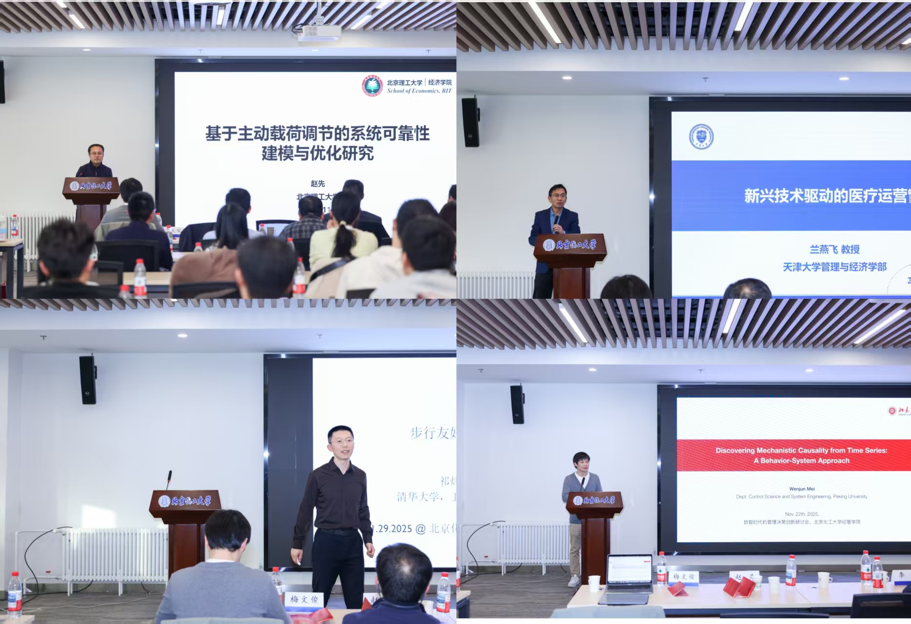 接下来,研讨视角进一步拓展至城市治理与数据科学领域,清华大学工业工程系祁炜副教授、北京大学工学院梅文俊研究员分别带来前沿研究成果分享。祁炜以《提升 “步行吸引力”:城市步行社区的数据驱动设施布局》为主题,基于城市居民出行大数据,深入分析了步行社区设施布局与居民出行意愿、生活便利性之间的关联,提出了以数据为支撑的设施优化配置方案,为破解城市“步行难”问题、打造宜居城市空间提供了科学依据;梅文俊则聚焦数据科学领域的核心难题,以《基于控制理论的时间序列机理性因果发现》为题,系统阐述了如何通过控制理论突破传统因果推断方法的局限,实现对时间序列数据中因果关系的精准识别,该研究成果为金融风险预测、环境变化分析等领域提供了更高效的数据解读工具。本环节由北京化工大学经济管理学院管理科学与工程系学科负责人吴军教授主持。