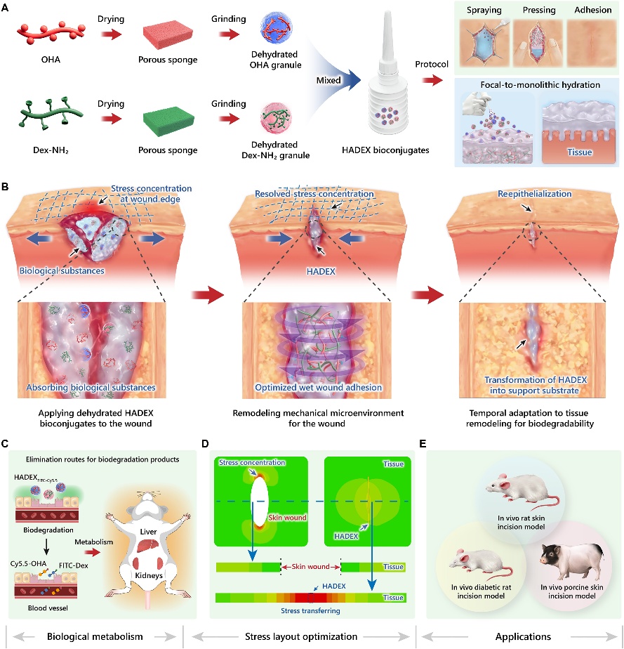 线性伤口在外科手术和慢性损伤中十分常见,但大多数研究还在用传统的圆形伤口模型,很难真实反映线性伤口特有的力学环境——尤其是伤口两端容易出现的“应力集中”现象,这往往会拖慢愈合速度。针对这一问题,研究团队开发了一种新型的湿黏附粉末系统HADEX。它由两种天然多糖衍生物组成,遇到组织渗出液后能迅速凝胶化,像一款“智能创可贴”,温柔地贴合伤口。HADEX通过动态化学键高效黏附,并借助微米级粉末快速吸收渗出液,在闭合伤口的同时,巧妙地将应力均匀分布,缓解尖端压力。更特别的是,它会随着组织自身的修复进程逐步降解,“默契配合”新组织的生长。在大鼠和猪的皮肤切口模型实验中,HADEX显著加速了伤口早期闭合和上皮再生,尤其在糖尿病伤口中也表现良好。它使用简便,有望成为新型创面敷料,为患者带来更舒适、更高效的无缝愈合体验。