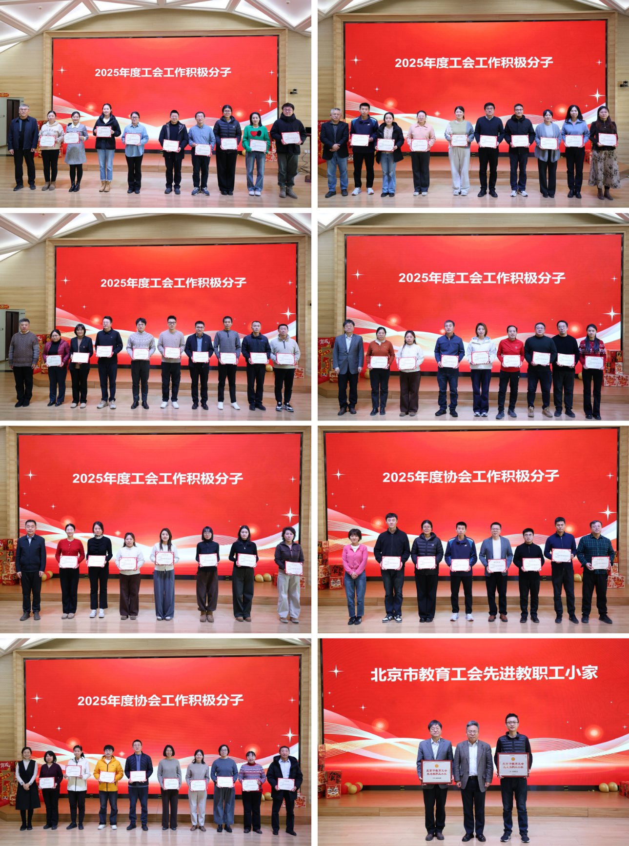 与会二级单位领导为刘志平等80位荣获“2025年度工会工作积极分子”、郭卫彭等24位荣获“2025年度协会工作积极分子”的教职工颁发了荣誉证书,甘志华为荣获“北京市教育工会先进教职工小家”的材料科学与工程学院工会、国际教育学院工会授牌。