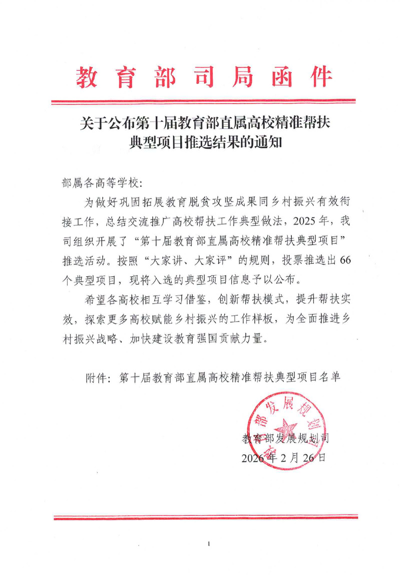 北化新闻网3月5日电 近日,教育部公布了第十届教育部直属高校精准帮扶典型项目的推选结果,我校申报的《写在科尔沁草原上的“金色答卷” 北化“四金”策略破解蓖麻产业振兴难题》和与北京林业大学等六校联合申报的《决战生态治理攻坚战 赋能乡村振兴大发展—六校组团助力“环科尔沁草原”生态实践案例》两项成果获评教育部直属高校精准帮扶典型项目。