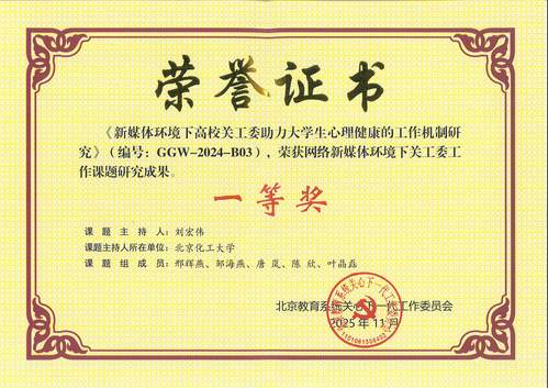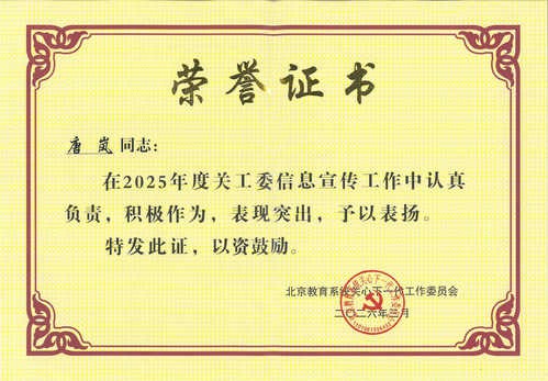 校关工委信息宣传工作获北京教育系统关工委表扬;材料科学与工程学院关工委、机电工程学院关工委、信息科学与技术学院关工委、化学学院关工委荣获“北京市‘五好’基层关工委”荣誉称号;我校《新媒体环境下高校关工委助力大学生心理健康的工作机制研究》课题获得北京教育系统关工委“网络新媒体环境下关工委工作课题研究成果”一等奖;唐岚同志获得北京教育系统关工委信息宣传工作表扬。