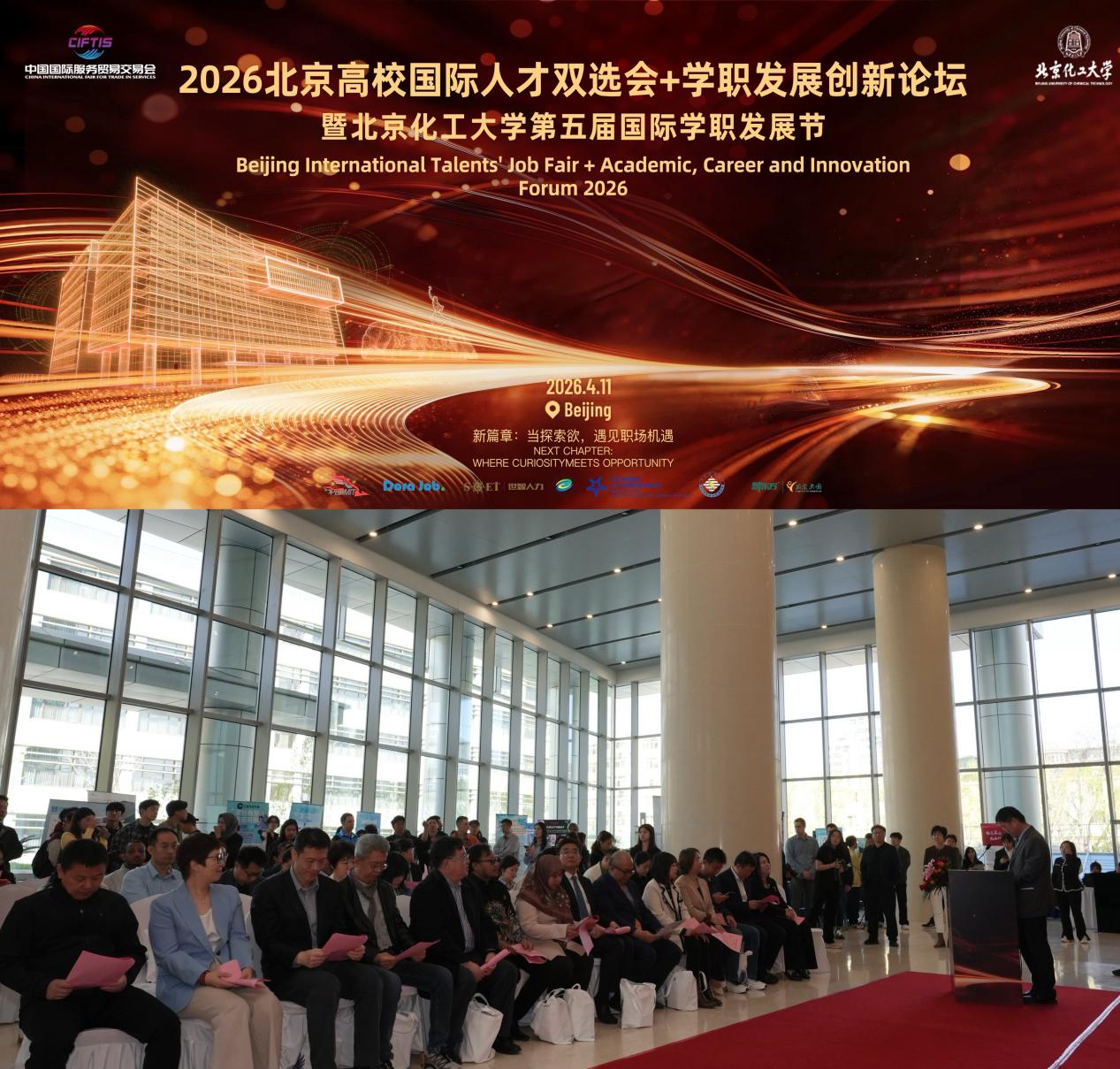 北化新闻网4月12日电 4月11日,2026北京高校国际人才双选会暨学职发展创新论坛暨北京化工大学第五届国际学职发展节,在北京化工大学朝阳校区高精尖研究中心大厅举行,本次大会以“新篇章:当探索欲,遇见职场机遇”为主题,旨在搭建高校、企业与学生之间的桥梁,服务国家对外开放战略和“一带一路”倡议,为中国企业“走出去”及国际企业“走进来”提供国际化人才支撑。