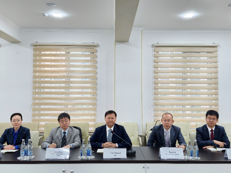 谭天伟在致辞中表示,今天正值中国二十四节气中的谷雨,象征着雨生百谷、万物生长、生机勃发,寓意着我们的合作也将丰收在望。北化代表团受到了学校的热情接待,大家对巴库的城市面貌和人文环境留下了深刻印象。正如皮里耶夫校长所言,在两国元首的外交引领下,两国关系越来越好,两国人民交往日益密切,为两校教育合作打下坚实基础。他详细介绍了北京化工大学的发展历程、校区建设、师生规模、本科和研究生教育、科学研究及项目经费等情况。他指出,双方共建的本科“3+1模式”北京化工大学巴库工程学院必将推动两校的教育合作走深走实,希望未来可以进一步推动延伸到研究生培养层次,促进双方研究合作,共同申报联合项目。