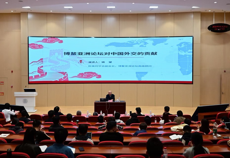 在专题讲座环节,姚望先生以宏阔的视野、翔实的数据和生动的案例,从博鳌亚洲论坛的缘起及目的意义、对亚洲合作的贡献、对我国周边外交的贡献等十个维度,全景式地展现了博鳌亚洲论坛从诞生到壮大的不平凡历程。他指出,博鳌亚洲论坛立足亚洲、面向世界,25年来已成为促进亚洲与世界对话合作的“金字招牌”,在服务国家外交战略、推动区域合作、促进全球治理等方面发挥了不可替代的作用。报告既有理论高度,又有实践温度,让在场师生对中国外交的智慧与担当有了更加立体的认识。