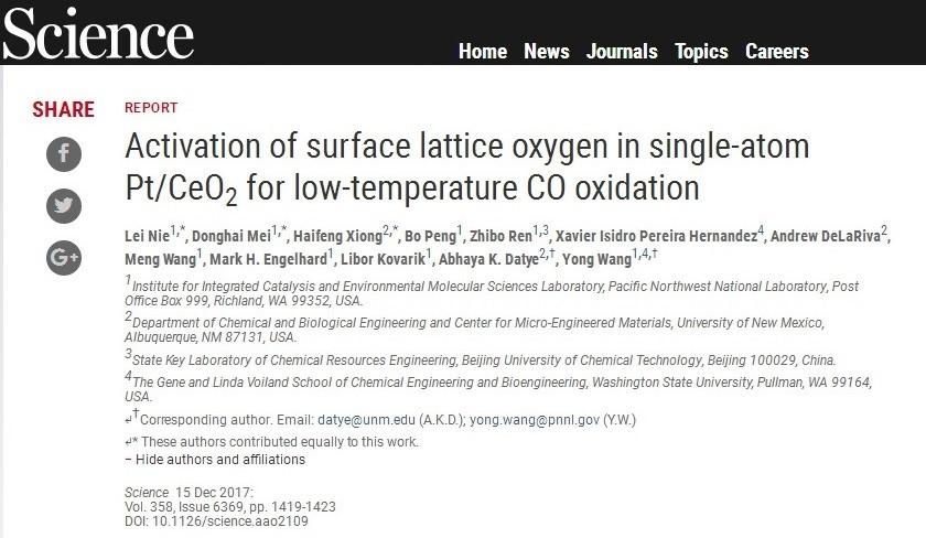我校任志博博士与美国西北太平洋国家实验室(Pacific Northwest National Laboratory)梅东海教授联合在《Science》发表研究论文(Article)