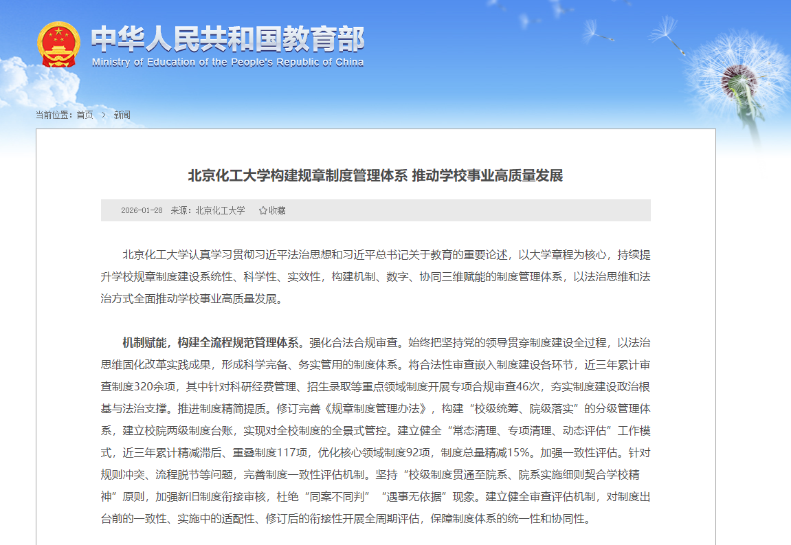 【教育部官网】北京化工大学构建规章制度管理体系 推动学校事业高质量发展