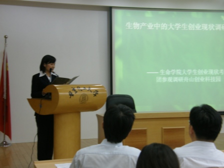 整个报告会共分为3大部分:“实践青春·以人为本”科学发展观实践行动、“时代责任·科技强国”科技志愿服务行动和“务实奋进·创业先锋”青年学生就业创业实践活动。06级制药党支部同学代表首先展示了其暑期实践成果。他们与建国门街道大雅宝社区和顺义太阳村开展共建活动,通过法制知识宣传、清扫街道等方式,服务群众回报社会。07级党支部在学院老师的带领下前往山东沂蒙老区,重温革命历史,参观现代化的鲁南制药厂,了解企业文化和企业用人标准,端正了就业观和成才观。07级制药专业的同学发挥专业特长,联系北京市药物监管部门,调查过期药品的回收情况,宣传正确的药物回收理念,为改善社会风气建言献策。此外,赴浙江舟山生物技术创业园考察大学生创业和赴京郊农村考察新农村建设的两支团队也向大家展示了他们的调研成果,精彩的团队实践过程和丰硕的实践成果博得了与会人员的阵阵掌声。