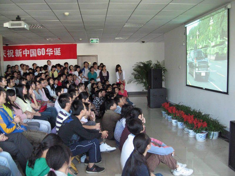 在新中国成立60周年之际,为了使在校同学能更好地观看到国庆庆典活动,同时也为了同学们在今天这样一个举国同庆的日子里能够共同庆祝新中国60岁华诞,10月1日一早,我校就在就业指导中心和北校区北功厅同时为同学们准备好了电视直播。中央电视台对我校组织学生观看庆典直播的准备工作做了采访,经管学院王琛同学代表化大学子在镜头前表达了对祖国母亲的美好祝愿。采访内容在当日9点35分的黄金时间在中央电视台一套节目中播出。