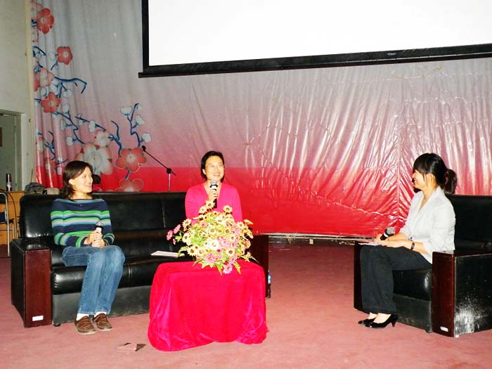 访谈在两位老师述说获得“十佳教师”称号的喜悦之情中展开。在一个半小时的访谈活动中,老师和同学们一起回顾了她们的工作和学习经历,以及如何选择了教师这个崇高的职业。现场还播放了两位老师的工作视频,使在场观众深深的体会到了她们对工作的认真负责和对学生的疼爱。活动中,两位老师在教书育人方面表达了自己的看法,她们都认为尊重学生、以严谨的教学态度去教育学生是一个老师的天职。最后,两位老师为我校08级、09级学生提出了中肯的建议,同时也表达了对大家的希望,希望同学们在面对各种压力的时候,要学会调整自己,注意身体,保持轻松的心态。访谈活动在一片轻松的氛围中圆满结束。