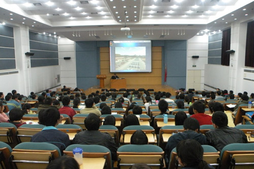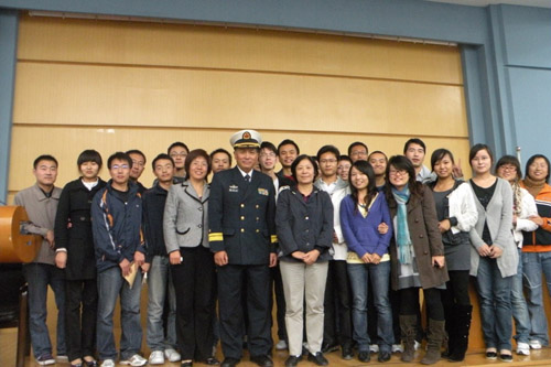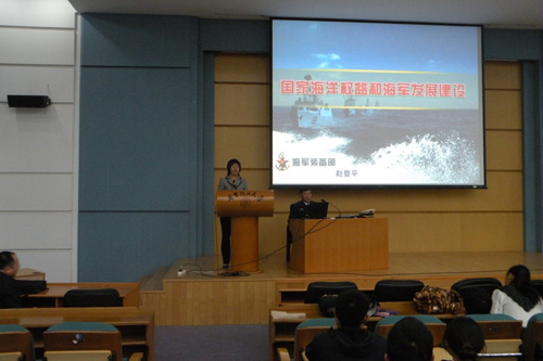 赵登平将军长期从事海军武器装备科研、生产和技术管理工作,相继荣获军队科技进步一等奖和国家科技进步特等奖,为海军装备建设做出了突出贡献。他从“维护国家海洋权益”及“海军武器装备建设”两个方面为同学们诠释了国家海洋权益的重要性以及海军装备发展的历史和现状。报告从海洋的划分讲起,引入并介绍了领海、毗连区、专属经济区、大陆架等基本概念;紧接着就第一岛链、钓鱼岛事件、春晓油田、南沙群岛等具体事件分别从政治利益、经济利益和安全利益三个角度阐述维护海洋权益的必要性和紧迫性;随后赵将军结合国庆60周年阅兵的照片和视频形象生动的向同学们介绍了当前我国海军装备的武器类型,并结合自身的科研经历和成果展示了海军装备的发展与实力,用事实证明了人民海军的日益强大和坚定捍卫国防和海洋权益的决心。