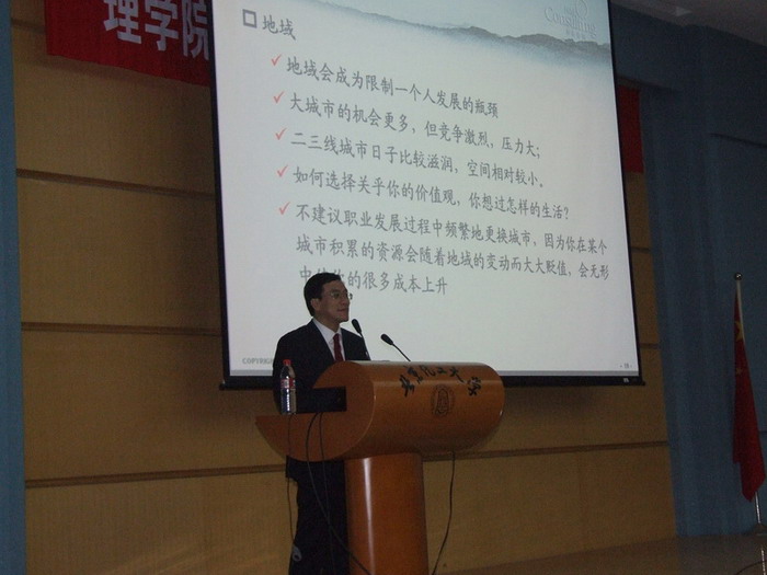 针对当前大三学生职业规划的困惑和大四学生面临就业的迷茫,周彦平先生在讲座中首先就以“你感受到就业压力的恐慌了吗?”、“一个优秀大学生的大学是怎样度过的?”两个非常亲切的话题为切入点,分析了当前大学生就业难的现实问题,大学生如何利用有限的校园时光修炼内功;接着又阐述了在生活中如何进行决策,应该考虑哪些方面的因素,其中又有哪些因素更为关键。讲座的重点放在了如何进行职业选择,周先生分别从地域、行业、企业、职业、自我价值等几个方面为同学们进行分析,时而旁征博引,时而风趣幽默,博得了同学们的阵阵掌声,尤其是“一颗珍珠的故事”,更是给同学们留下了深刻的印象。周先生还就如何确立职业目标做了详细的介绍,并鼓励大家要沉住气、踏实干,干出一番属于自己的事业。讲座的后半段,周先生又概括了人生各个阶段的职业选择和规划,一句句经典的话语引来了同学们的笑声不断,“一三五”的原理更是让同学们频频点头称是。在互动环节,同学们又对自己心中的疑惑提出了问题,包括人生观价值观等很多方面,周先生都做出了精彩的解答。最后,周老师总结了今天讲座的主要内容,提出并解释了职业生涯规划的最高境界这一概念,同时对大三和大四同学提出了殷切的希望。