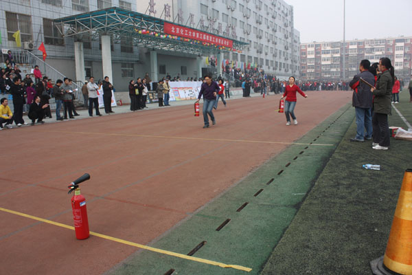 随后的比赛进行的如火如荼,鼓励的掌声、加油的呼声,声声震天。在水龙带连接接力中,一组组矫健的身姿,一个个熟练,准确,快速的连接,仿佛是一幕幕专业消防队员的表演;灭火器持重接力赛的前方仿佛就是火场,参赛健儿更是奋勇争先,手持灭火器冲入火场,降服火龙。搬重物接力赛和消防桶盛水接力赛彰显了选手们的自信,再快点,人身财产就会减少,再快些火灾就会扑灭。跌到了奋力站起来,失误了重新再来。赛场上书记、院长亲自坐镇指挥,更有站在跑道上的各级领导,在参赛的人员中有已年过半百的老教授,还有新入校的年轻教师。有学校一线的教学科研的带头人,也有管理部们的干部;有校办企业的老总,还有为学校提供后勤、服务保障的电工,厨师,服务员。