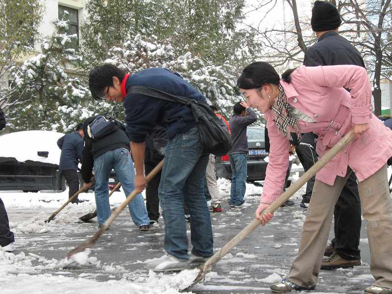 教学楼西侧干道是我校广大师生通往办公楼、教学楼、图书馆、食堂的重要路线,降雪给师生们的出行带来诸多不便。为了营造良好的出行条件,在院党总支的号召下,在学院领导的带领下,我院师生积极主动拿起铁锨、扫把开始了打扫。虽然天气寒冷,过往的车辆时而将积雪和泥水溅到大家的鞋裤上,但大家依就精神饱满、干劲十足,尤其是几位年龄较大老师,纵使额头上已是汗珠密布,但还是坚持“战斗”在扫雪场地上。