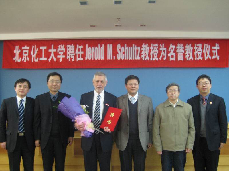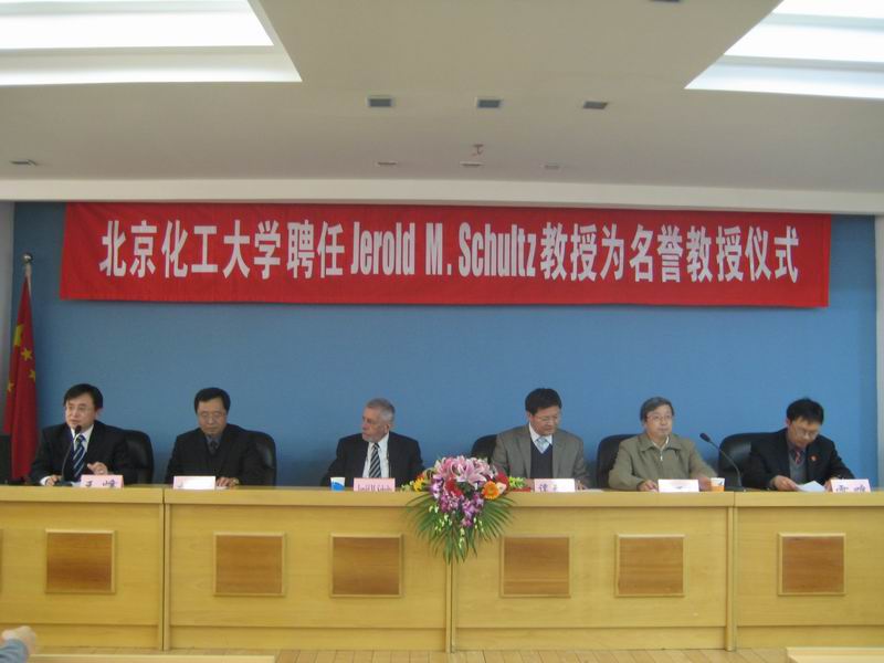 首先由材料学院院长杨万泰教授介绍了Jerold M. Schultz教授的履历及研究成就,然后副校长谭天伟教授为Jerold M. Schultz教授颁发名誉教授聘书,学生代表为Jerold M. Schultz教授献花并佩戴校徽。随后,副校长谭天伟教授代表学校对Jerold M. Schultz教授聘任为我校名誉教授表示热烈的欢迎,并且对Jerold M. Schultz教授来我校任名誉教授表示感谢。最后,Jerold M. Schultz教授发表了热情洋溢的讲话,他表示希望能够为化工大学做点实际工作,并会为我校科研的进一步发展做出应有的贡献。