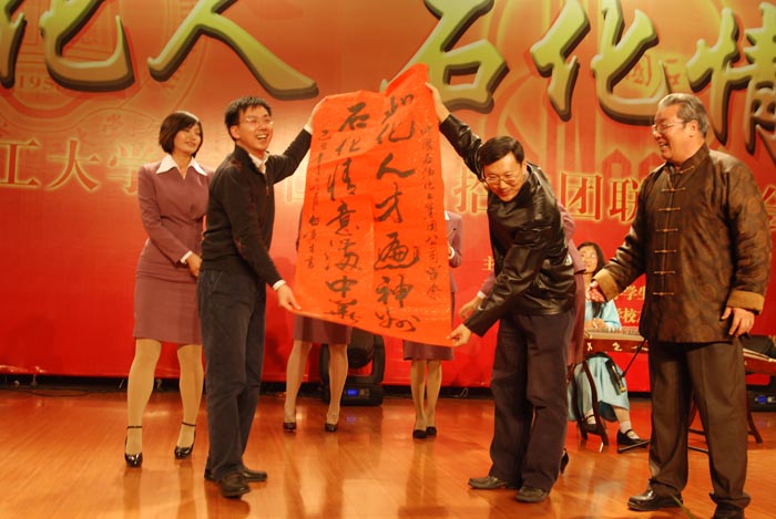 在我校长期发展过程中与中国石油化工集团公司有着不解的情缘,历年来向中石化输送了4000多名人才,他们在中石化展露才干,作出重要贡献。中石化公司人事部胡翔、北京化工研究院原党委书记于文秀、燕山石化发展研究中心主任丛煜、中石化洛阳石化组织部副组长汤雁丽女士分别在晚会致辞,通过自身的经历鼓励同学们从基层做起,在祖国最需要地方建功立业。本次晚会体现出我校与中国石油化工集团公司的友谊,展现我校学子全面的综合素质,丰富了我校学生的课余生活,为本次中国石油化工集团公司在我校举办的大型招聘会画上了圆满的句号。(学生工作办公室、校友总会、素质教育基地)