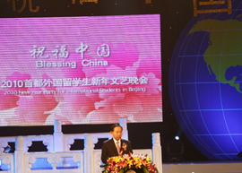 12月4日晚7时,“祝福中国.2010首都外国留学生新年文艺晚会”在中国人民大学如论讲堂举行,晚会由教育部主办,北京市教委承办,首都各高校留学生参加演出。教育部新任部长袁贵仁出席晚会并讲话,继而拉开了演出的大幕。袁贵仁部长在致词中指出,自中华人民共和国成立60年来,随着中国与世界各国友好交往与合作的不断加强和高等教育国际化趋势日益明显,越来越多的外国学生和青年学者把目光投向中国。目前,在华学习的外国学生总数已近23万人,中国正在逐步成为国际学生流动最重要的目的国之一。