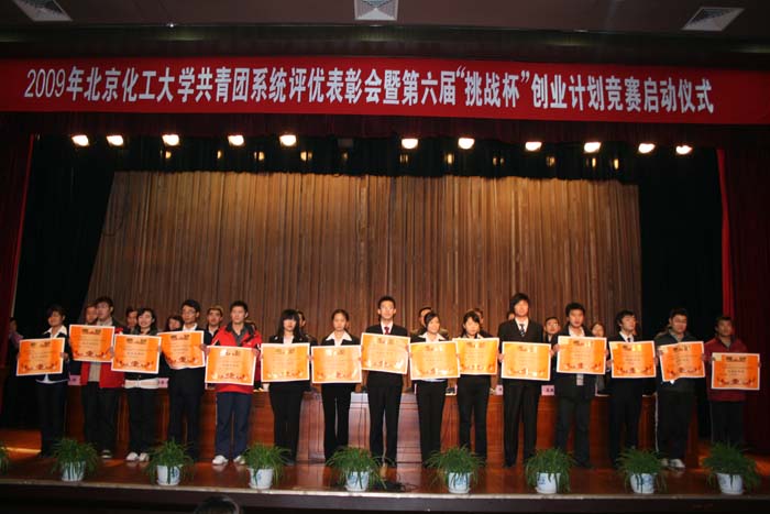 2009年12月24日下午3:30,2009年北京化工大学共青团系统评优表彰会暨第六届“挑战杯”创业计划竞赛启动仪式在科学会堂隆重举行。校党委副书记兼副校长任新钢,学工办主任罗伟,北化大投资有限公司董事长李新军,教务处副处长张凤元,学工办副主任王小健,学工办副主任兼校团委书记邹立娜,北区办副主任庞然,研究生院副院长许利民,生命学院副院长刘军锋及各学院分党委(党总支)副书记出席了本次大会。“挑战杯”创业计划竞赛指导教师,经管学院张英奎教授、周荣喜教授及化工学院刘研萍教授也应邀参加了此次会议。