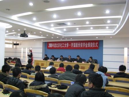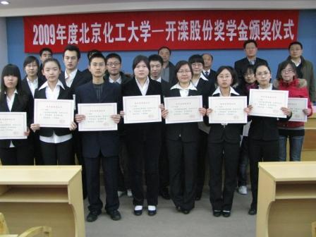 2009年12月28日,2009年度“北京化工大学——开滦股份”奖学金颁奖仪式在图书馆会议中心隆重举行。校党委副书记兼副校长任新钢老师、开滦能源化工股份有限公司董事、党工委副书记高启新先生、化学工程学院分党委书记屈一新老师、学工办主任罗伟老师、开滦能源化工股份公司人力资源部部长梁刚先生出席了颁奖典礼。颁奖仪式由化学工程学院分党委副书记商云龙老师主持。