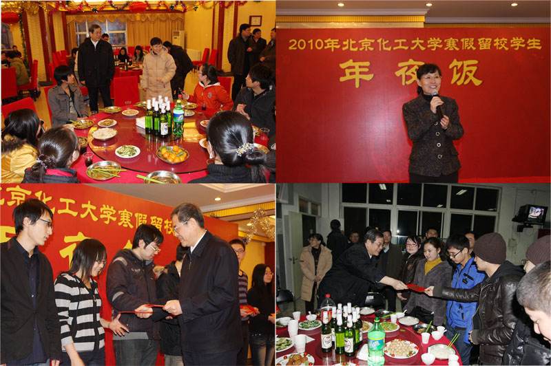 晚6:00,校领导一行来到校招待餐厅和回民食堂看望在校过年的学生,学生工作部、研究生院和各学院的领导也都到场看望春节在校过年的学生。学校后勤服务集团为假期在校学生准备了丰盛的年夜饭。校党委书记王芳代表学校向同学们表达问候和祝愿,她祝愿所有留校过年同学的家人健康快乐,场面感人温馨。校长王子镐代表学校向同学们发放了“红包”——春节慰问金,就像家中的长辈一样祝福每一个孩子。最后,所有领导、老师和同学共同举杯祝愿新春快乐。师生们在一片热烈的祝福声中度过了这一难忘的时刻。