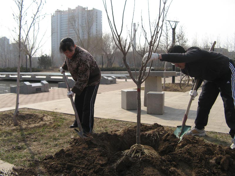 此次活动共设四个植树地点,分别是昌平校区学生公寓3、4号楼南侧,新建学生公寓5、6号楼南侧,荷花池景点西侧和教学楼北侧。首先副校长李显扬对这次植树活动进行了动员,校园中心主任周长杰对本次植树活动提出了具体的要求。在学校领导带领下,大家分成四个劳动小组,纷纷拿起工具,到各植树地点,热火朝天地干了起来。他们有的挥锹铲土、有的扶苗填坑,干劲十足。经过近两个小时的劳动,共栽植银杏树26棵,樱花8棵和玉兰30棵,沙地柏500余棵,移植法桐6棵。