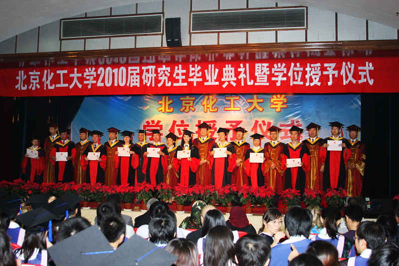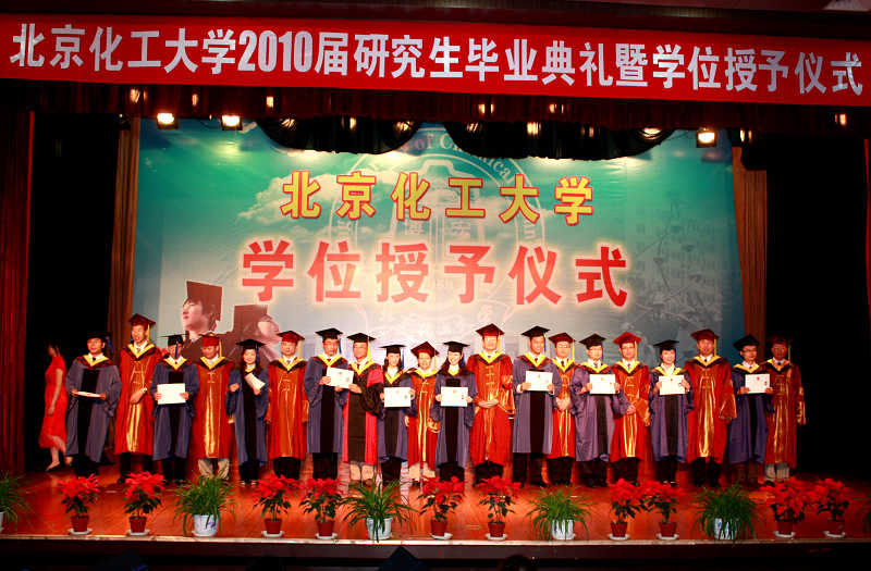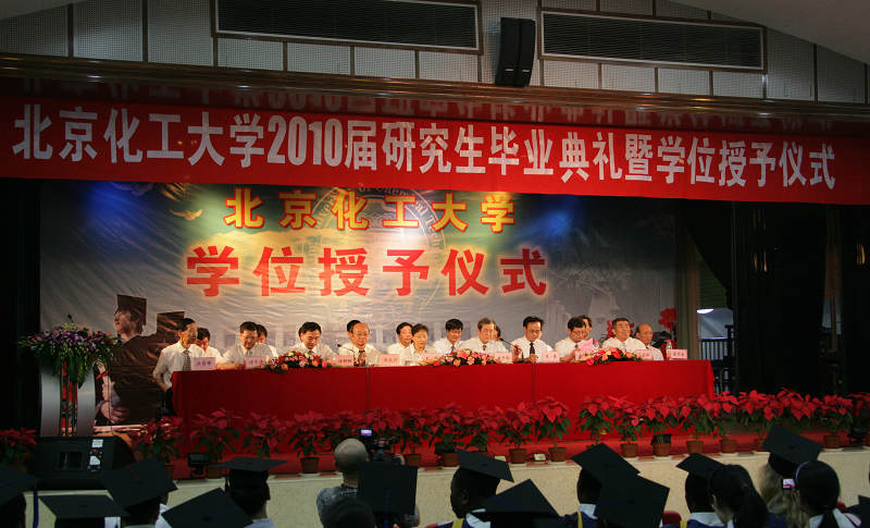 6月26日,北京化工大学2010届研究生毕业典礼暨学位授予仪式在地下礼堂隆重举行。北京化工大学党委书记王芳教授、校长王子镐教授、校学位评定委员会副主席汪文川教授、副校长王贵教授、党委副书记王同奇教授、副校长谭天伟教授、李显扬教授、党委副书记关昌峰教授、副校长陈冬生教授。出席仪式的还有各学院院长、分党委书记,校学位评定委员会委员、导师代表、学院辅导员以及毕业研究生及家属代表共1000余人。毕业典礼由校党委副书记兼副校长任新钢主持。