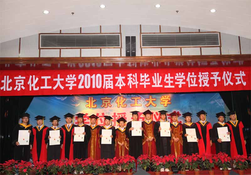 在庄严的国歌声中,学位授予仪式拉开帷幕。主持人宣读各学院获得学士学位名单后,各学院院长分别代表学院教师寄语2010届毕业生,他们向毕业生表达了衷心的祝贺、美好的祝愿和殷切的希望。2010年,我校共有本科毕业生2933人,经教务处审核,北京化工大学学位委员会认定,共计2844人获得学士学位。其中,来自尼日利亚的雷克和孟加拉国的赫克两名留学生也顺利获得了学士学位。