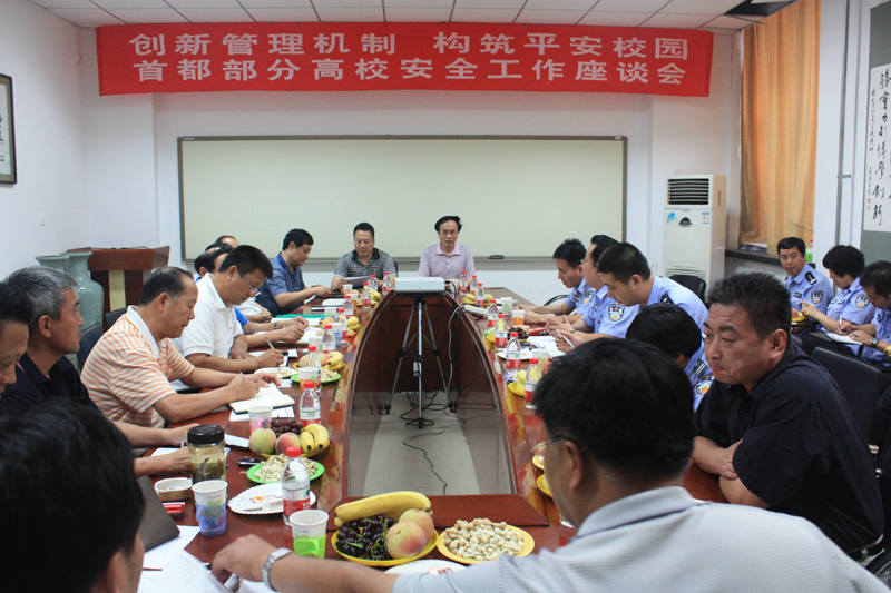 9月7日下午,北京市公安局文保处在我校召开首都部分高校“平安校园”建设研讨会。中国传媒大学、对外经贸大学、北京中医药大学、首都医科大学、首都经贸大学、北京第二外国语学院、北京物质学院、中华女子学院、北京服装学院、北京农学院、北京石油化工学、北京化工大学等十二所高校的保卫处处长和北京市公安局文保处大三处全体干警参加了会议。