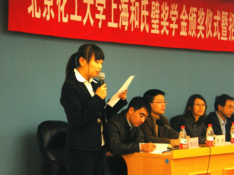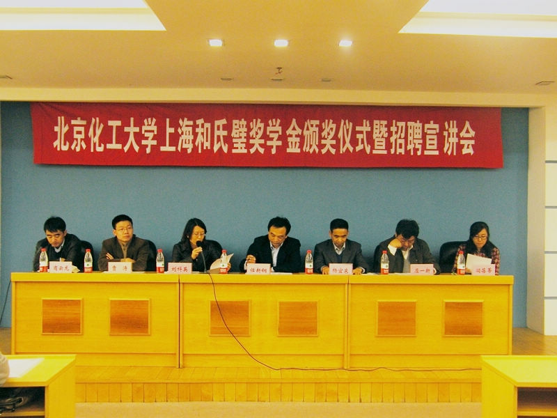 11月1日下午,北京化工大学上海和氏璧奖学金颁奖仪式暨招聘宣讲会在我校图书馆中心会议室举行。校党委副书记兼副校长任新钢,上海和氏璧化工有限公司业务拓展总监刘科英女士,上海和氏璧化工有限公司北方行政人事经理、北京办事处经理杨宜东,化学工程学院分党委书记屈一新和学生工作办公室副主任贾涛等出席了仪式。仪式由化学工程学院分党委副书记商云龙主持。