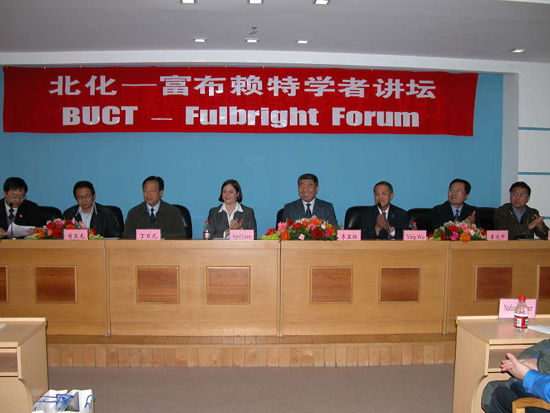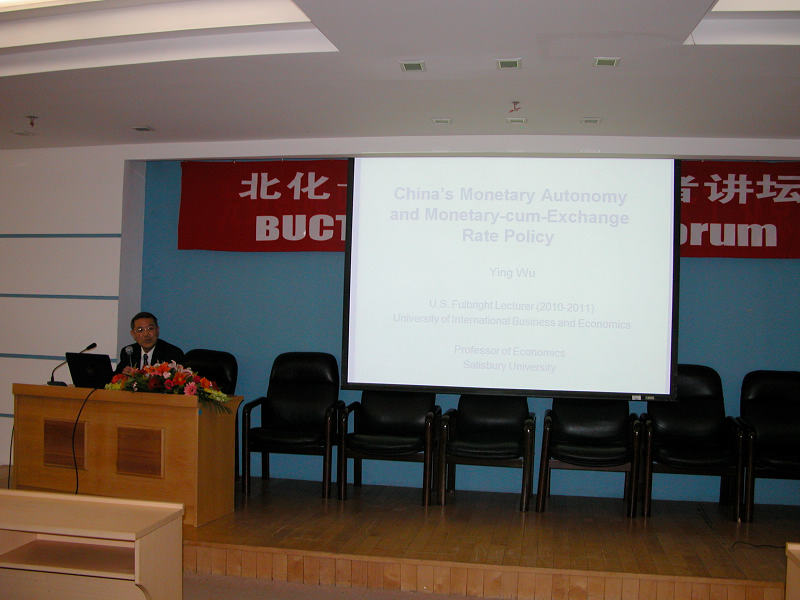 启动仪式结束后, 富布赖特学者Wu Ying教授(Salisbury大学经济学教授,北京大学光华管理学院客座教授)为我校师生带来了此次讲坛的第一场讲座“全球化时代中国货币自主性”。与此同时,我校经管学院、文法学院、人事处、国际处及教师代表与美国驻华使馆教育交流中心的来宾进行了座谈。我校经管学院总支书记张建文、文法学院院长甫玉龙分别向在座的嘉宾介绍了两院的教师队伍建设、教师出国培训、学术交流开展情况。随后,中心主任Ingrid Larson女士详细介绍了富布赖特项目,使我们对富布赖特项目有了更多的了解。“北化-富布赖特学者讲坛”在11月10日、18日及24日还将安排3场讲座。(国际处、人事处、经管学院、文法学院供稿)