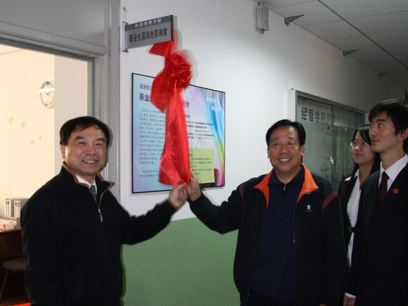 2010年11月23日上午,经济管理学院职业生涯规划咨询室揭牌仪式在化纤楼205举行,校党委副书记兼副校长任新钢、原副校长经济管理学院代院长丁巨元、学工办主任罗伟、经济管理学院党总支书记张建文、经济管理学院党总支副书记张馨、辅导员、学生代表等出席了接牌仪式。任新钢和丁巨元老师共同为职业生涯规划咨询室揭牌。
